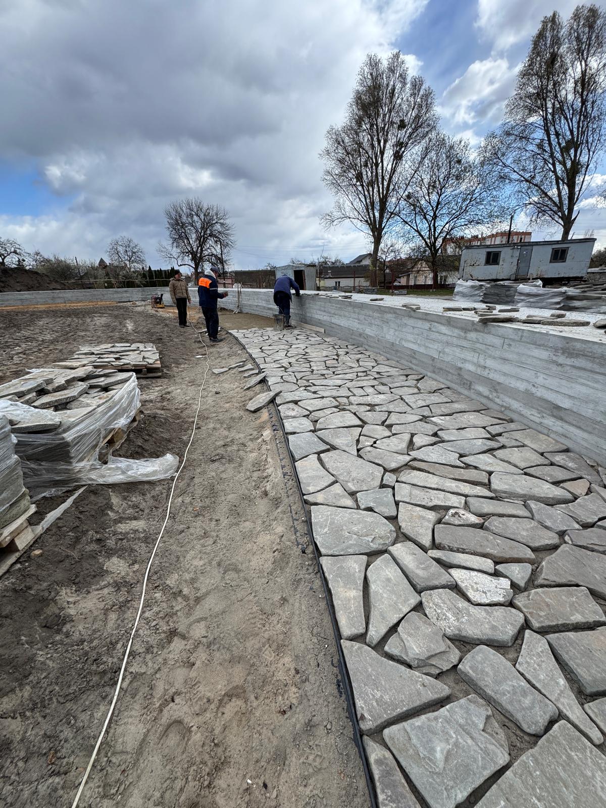 - Laying out the sandstone pathways at the site of the Brest cemetery memorial construction site
