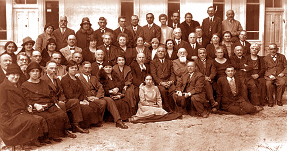 Ahuzat Bayit 1929. Akiva Arieh Weiss front row, centre. Photo credit: Unknown author Public domain, via Wikimedia Commons