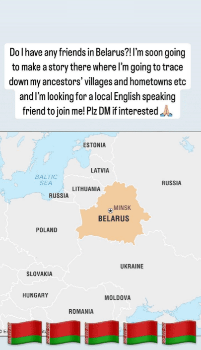“Do I have any friends in Belarus?! I’m soon going to make a story where I’m going to trace down my ancestors’ villages and hometowns etc., and I’m looking for a local English-speaking friend to join me!”