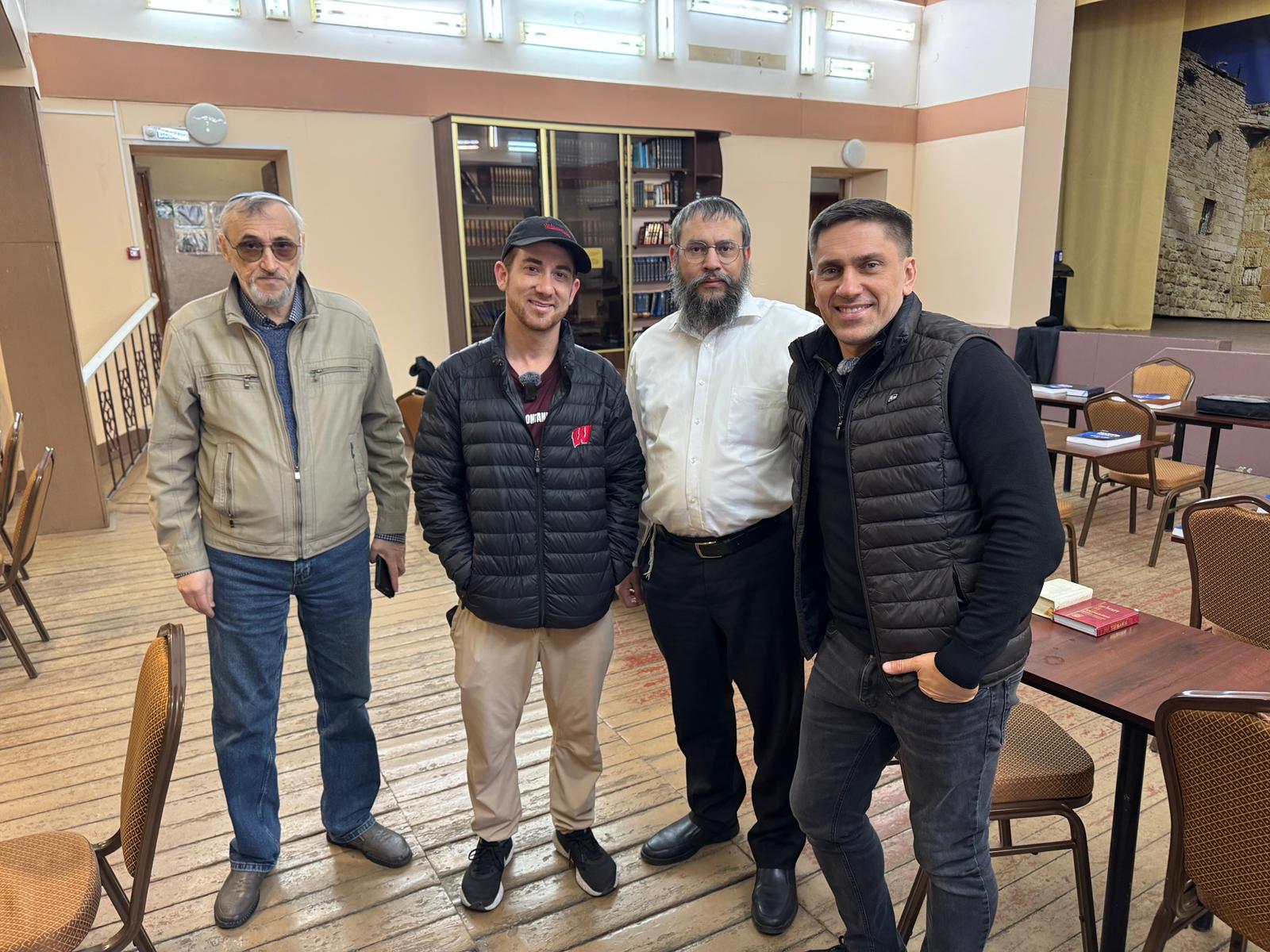 - Left to right: Efim Basin (member of Brest community), Drew Binsky, Rabbi Chaim Abramovitz, Artur Livshyts at the Ekdesh Synagogue, Brest