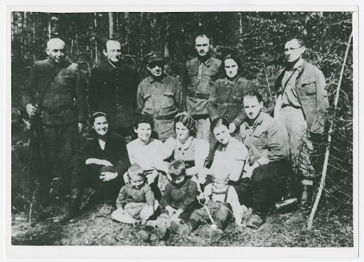 Partisans: Yehuda Bielski - sitting, second row right - and some Bielski Partisans in the Naliboki Forest 1943