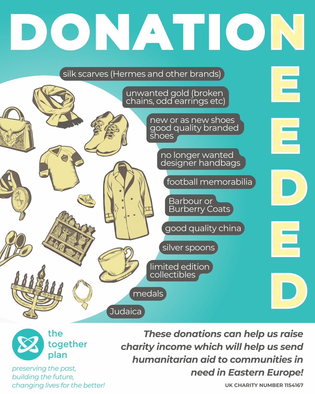 Last year, we started up an eBay online shop to help raise the funds needed to keep the project going, and we have made a good start. We are now looking for some local volunteers to help us grow this project. So if you are reading this, are based in the north London or Watford, Hertfordshire area, and would like to lend a hand and be part of an amazing team—we would love to hear from you. Additionally, you might want to help us by donating these items, which we can sell to raise the funds we need: silk scarves (Hermes and other brands), unwanted gold items (broken chains, bracelets, odd earrings, rings, etc.), new or as-new good quality branded shoes, football memorabilia, Burberry or Barbour coats, good-quality china, silver spoons, limited edition collectibles, medals, Judaica. There are so many ways to support this important project—and we really hope you will get behind us so that we can keep doing what we do and help the people who need our support.
