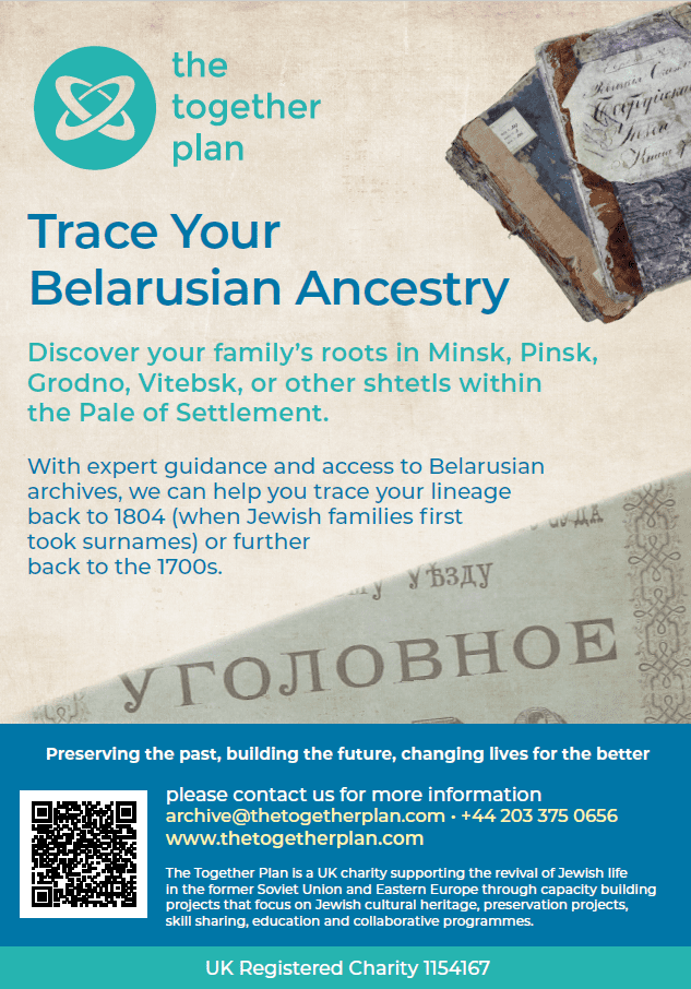 We are thrilled to highlight the invaluable support of our partner charity in the USA, Jewish Tapestry Project, which was established in 2021 by Debra Brunner, the founder of The Together Plan. This partnership has been instrumental in helping us connect with people in America who have Belarusian ancestry and those who wish to support our mission. By fostering these connections, Jewish Tapestry Project is playing a crucial role in amplifying our reach and ensuring that the stories and heritage of Belarusian Jews are preserved and celebrated.